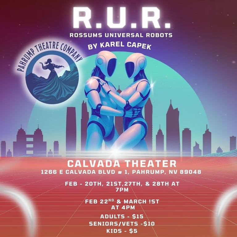 In this production, Pahrump Theatre Company brings R.U.R. to life with a sleek, high energy approach inspired by modern tech culture and innovation. The line between human and machine slowly breaks down as artificial beings begin to question their purpose and the humans who created them.